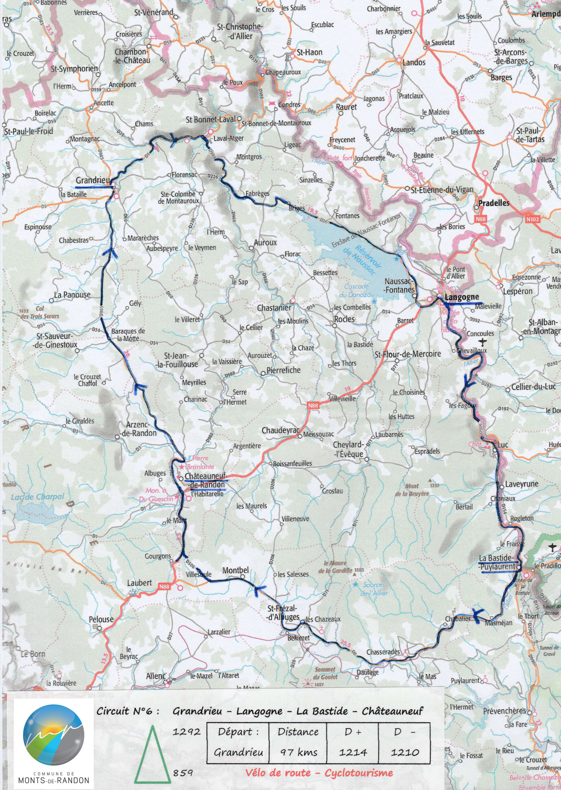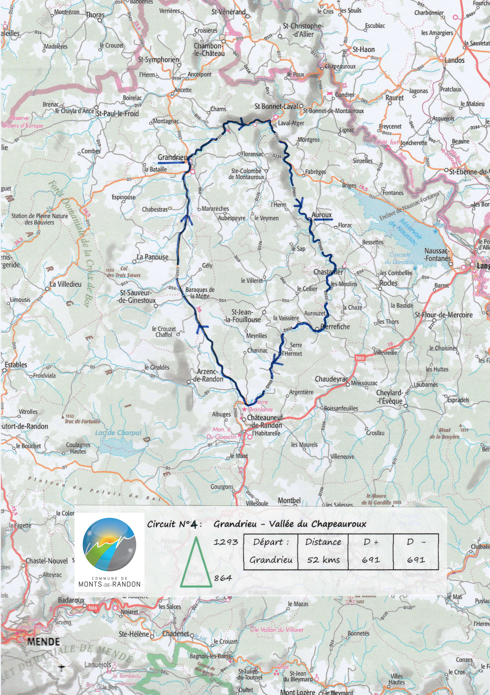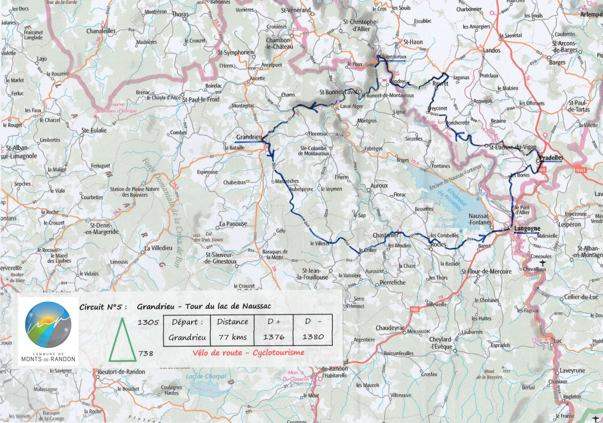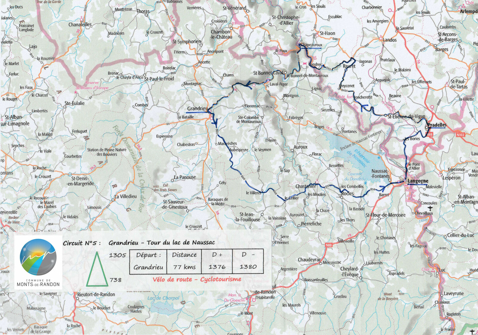 Circuit N°4 - Grandrieu Vallée du Chapeauroux - 52 km | Circuit N°5 - Grandrieu Tour du Lac de Naussac - 77 km | Circuit N°6 - Grandrieu Langogne La Bastide Châteauneuf - 97 km |