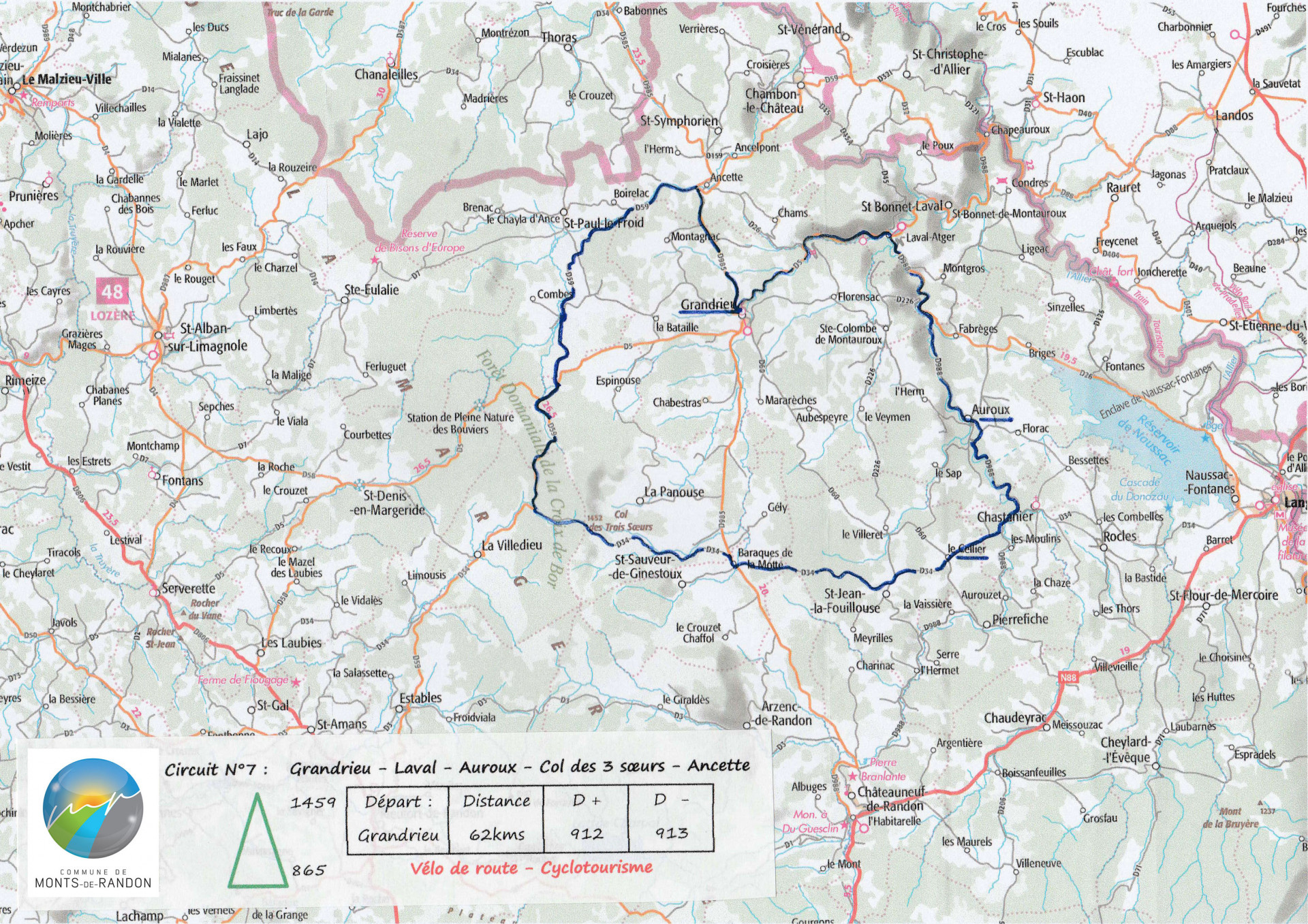 Circuit N°7 - Grandrieu Laval Auroux Col des 3 soeurs Ancette - 62 km | Trèfle à 4 feuilles - 37 km - 34 km - 33 km - 27 km |