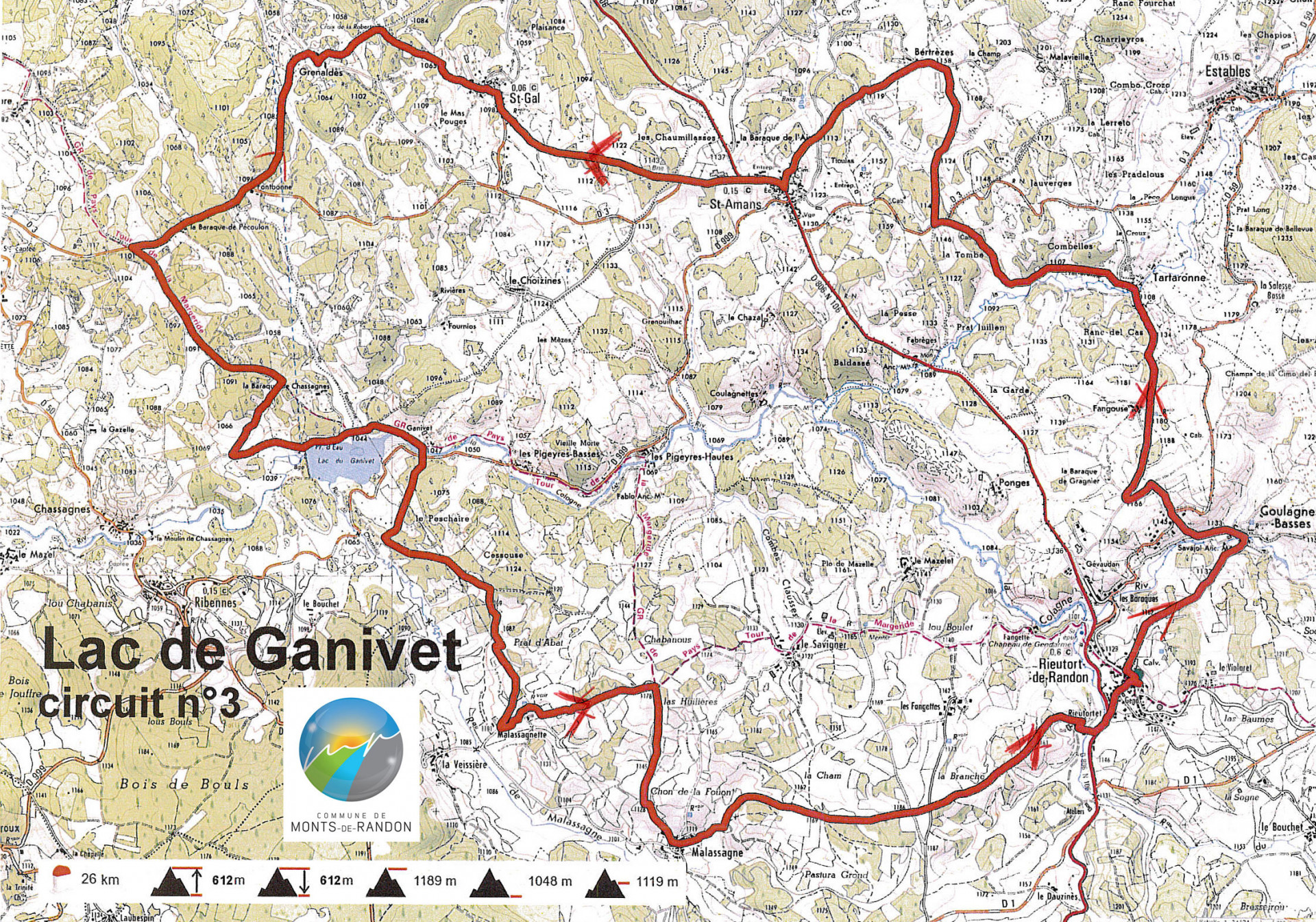 Circuit N°1 - Circuit familial - 10.9 km | Circuit N°2 - Tour des villages - 19.8 km | Circuit N°3 - Lac de Ganivet - 26 km |